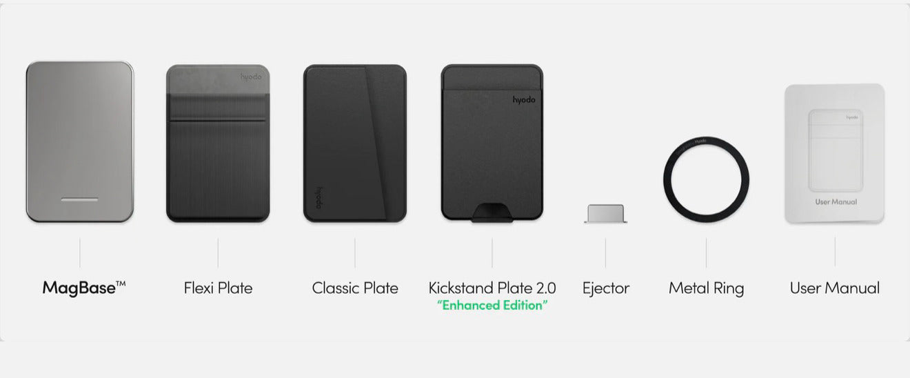 W komplecie znajdziesz: MagBase™, Flexi Plate, Classic Plate, Kickstand Plate 2.0, pierścień magnetyczny, narzędzie do demontażu oraz instrukcję użytkownika.